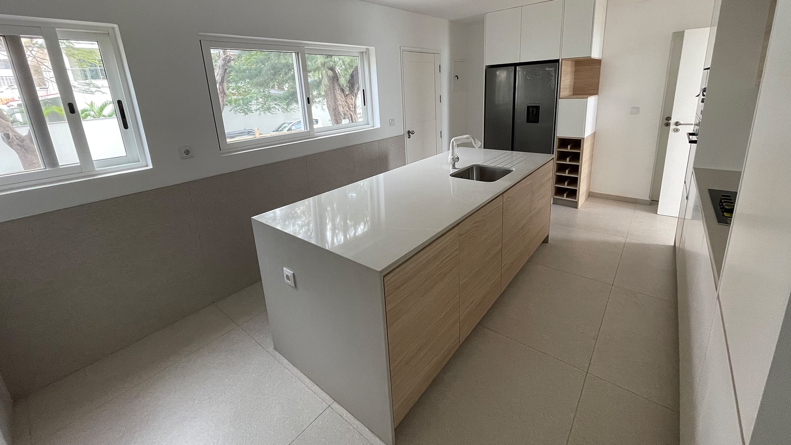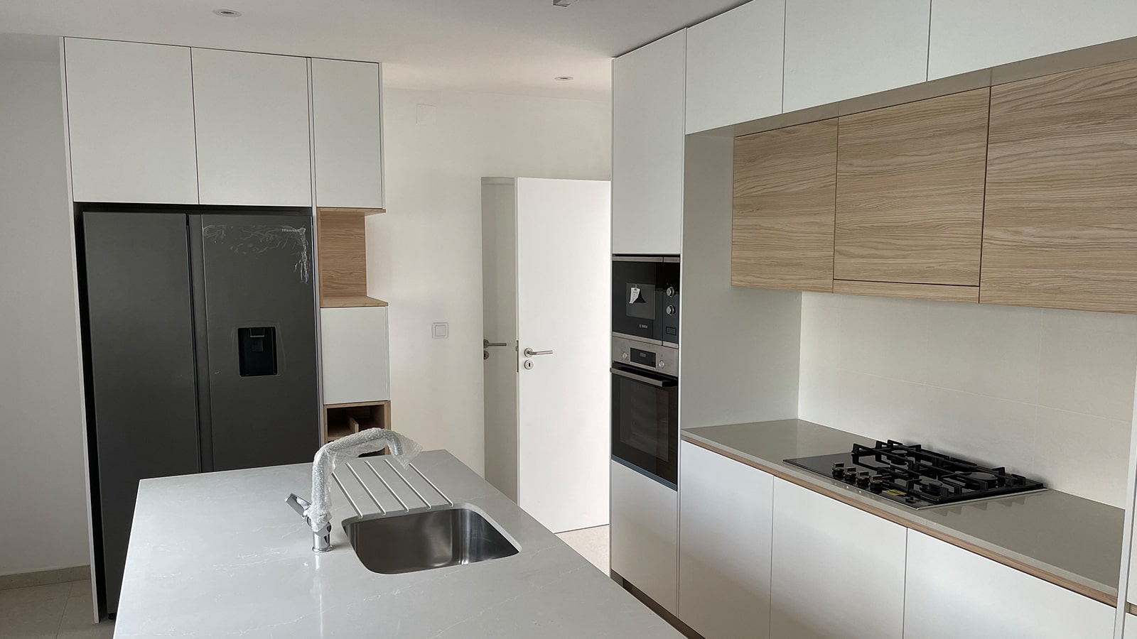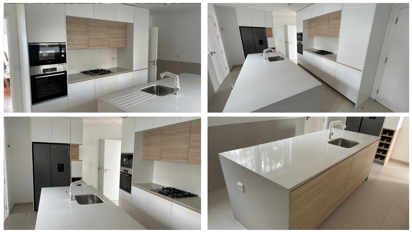 O projeto da cozinha foi concebido com um layout espaçoso para permitir uma circulação confortável e facilitar o trabalho na área de preparação e cozimento dos alimentos.