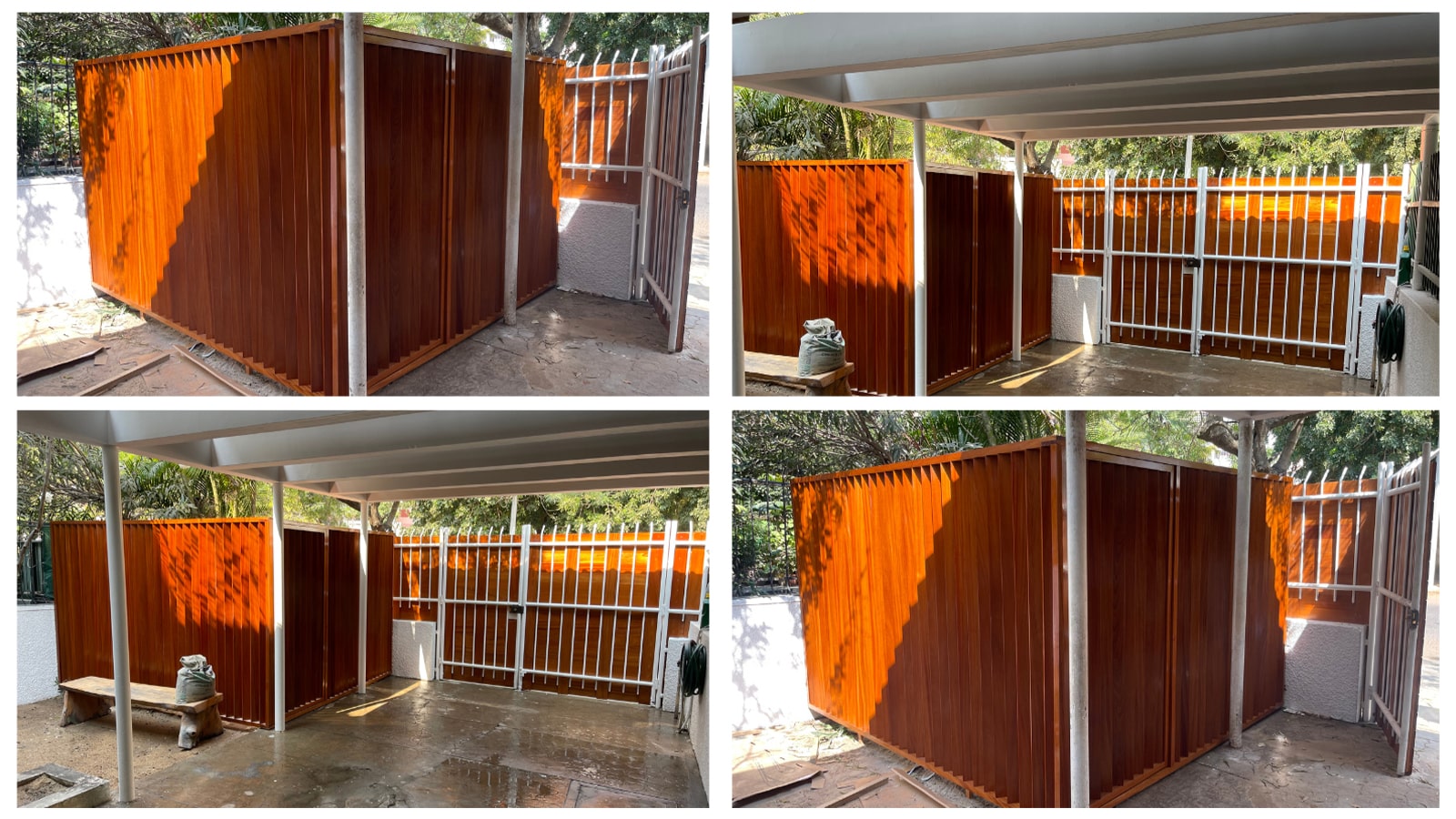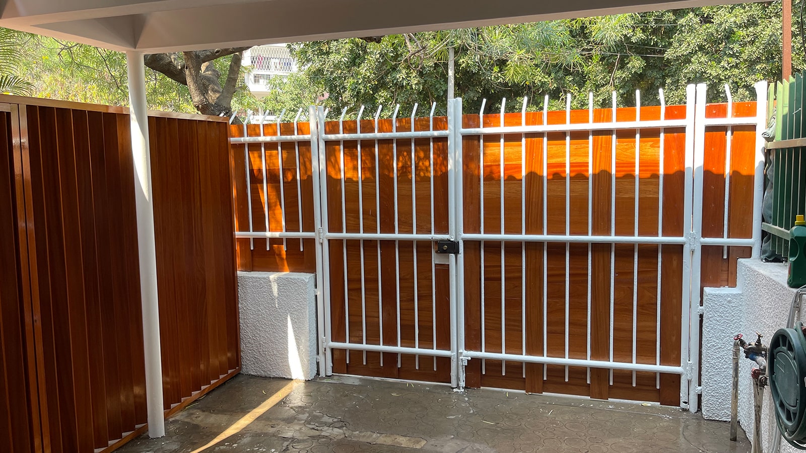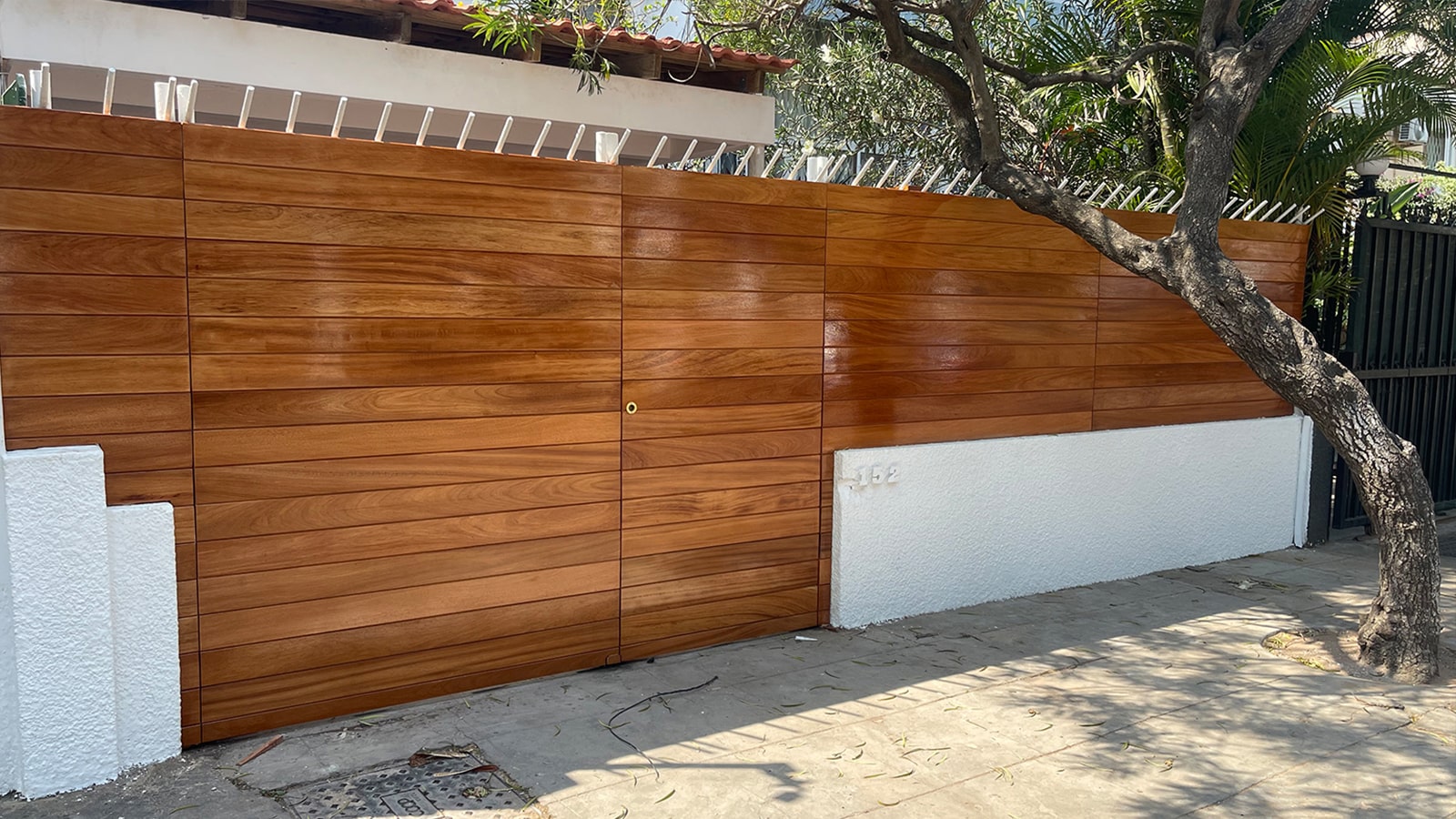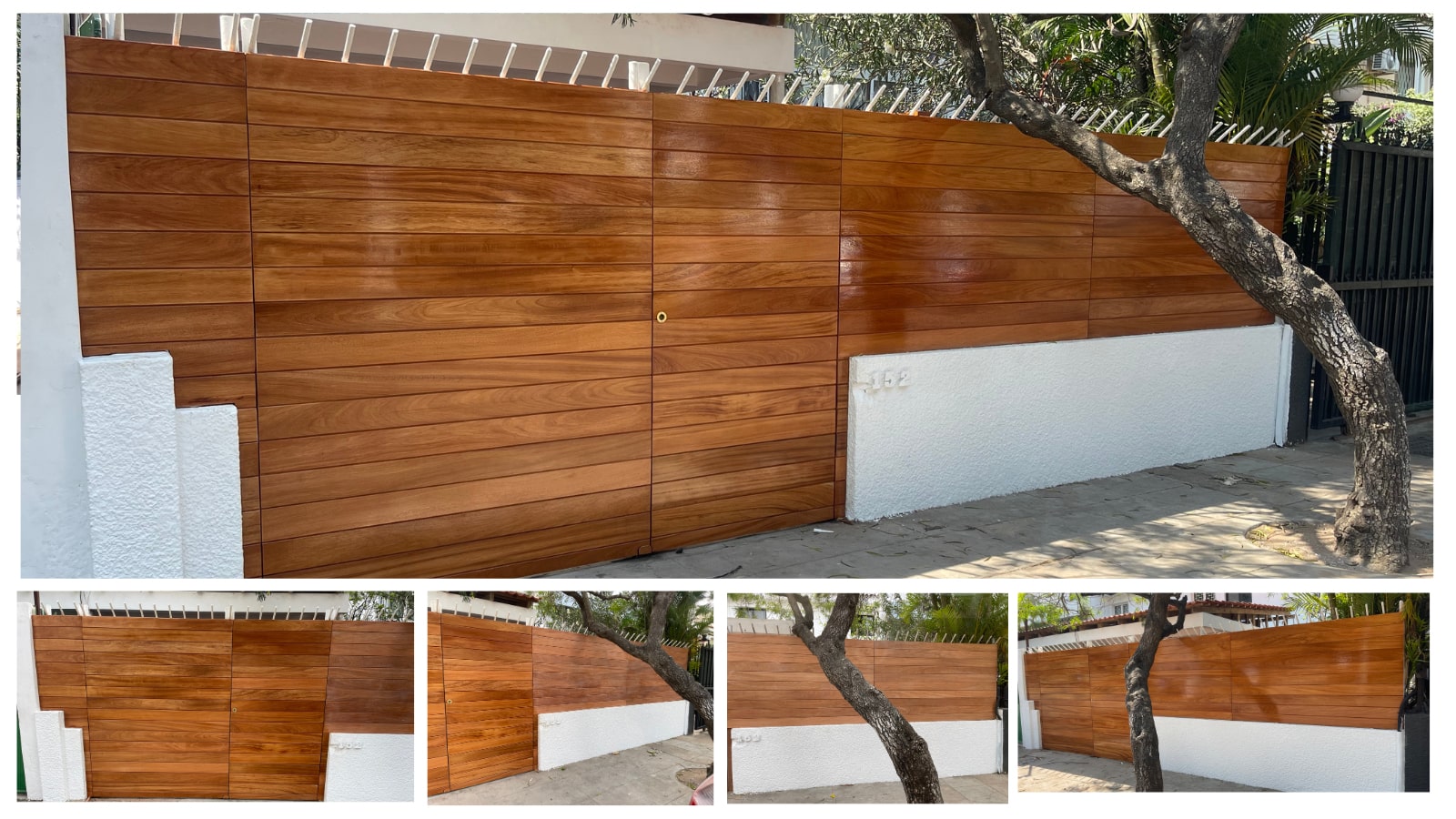 "Este revestimento externo em madeira maciça, cuidadosamente aplicado sobre muro e portões, destaca-se pela sua durabilidade e beleza. Tratada para resistir às intempéries, a madeira proporciona um visual encantador e convidativo, enriquecendo o ambiente com seu charme natural."